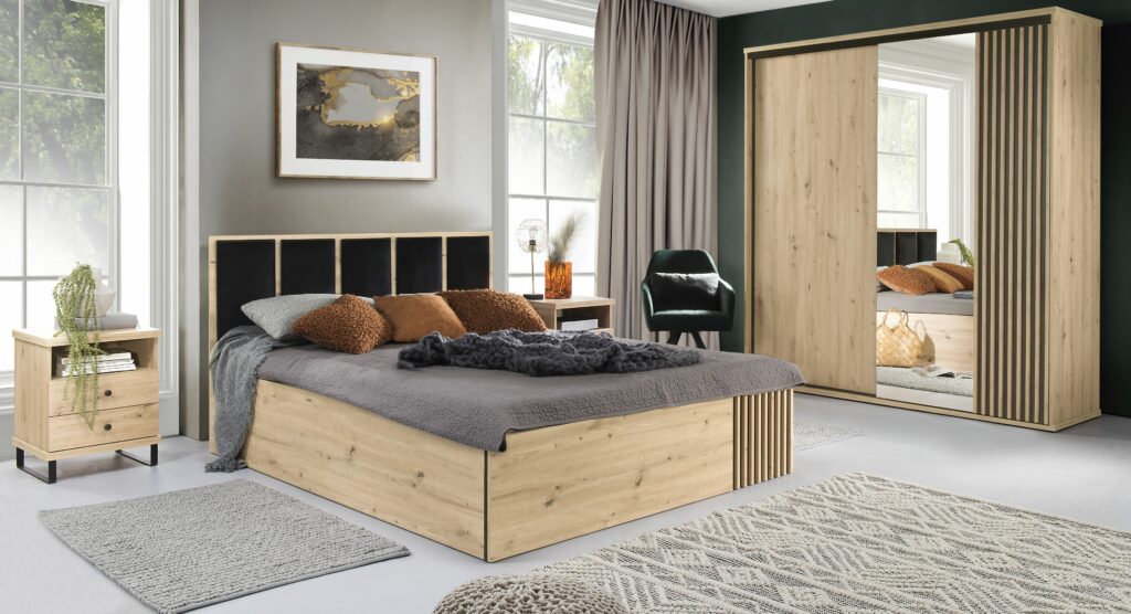 Le mariage du chêne et du noir confère à l’armoire ZEBRA un caractère distinctif et contemporain, capable de s’harmoniser avec différents décors intérieurs. La porte avec miroir agrandit visuellement l’espace, tout en offrant un point pratique pour vos préparations quotidiennes. Les portes coulissantes garantissent une utilisation fluide et économisent de l’espace, ce qui est particulièrement bénéfique dans les pièces plus compactes.