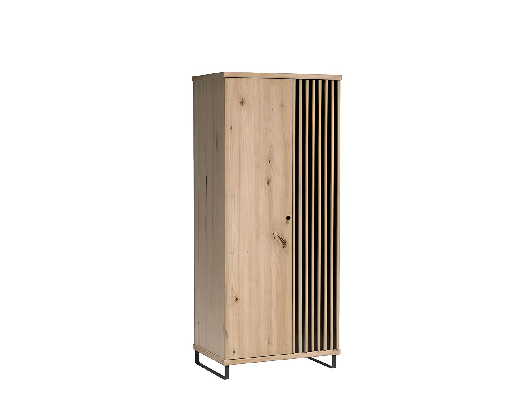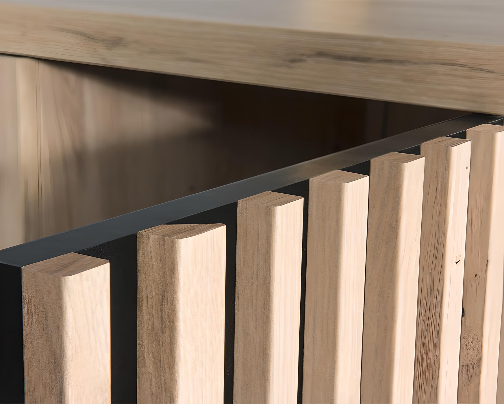 Les portes de l’armoire sont ornées de bandes décoratives en forme de lattes, conférant à l’ensemble une texture visuelle riche et un caractère distinctif. Ces détails, associés à la finition chêne et noir et complétés par une poignée discrète mais élégante, créent une pièce de mobilier à la fois fonctionnelle et esthétiquement attrayante. Les pieds en métal massif, d’une hauteur de 10 cm, non seulement élèvent l’armoire, facilitant le nettoyage sous le meuble, mais ajoutent également un élément de design industriel moderne à sa silhouette.