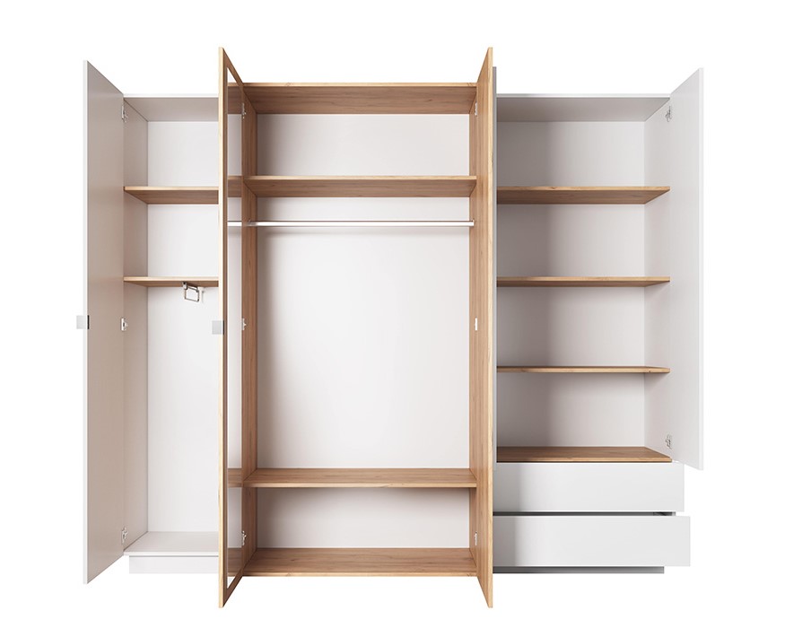 Armoire Chambre double penderie et étagères 4 portes 2 tiroirs 220cm Blanc et Chêne – ALMOSA