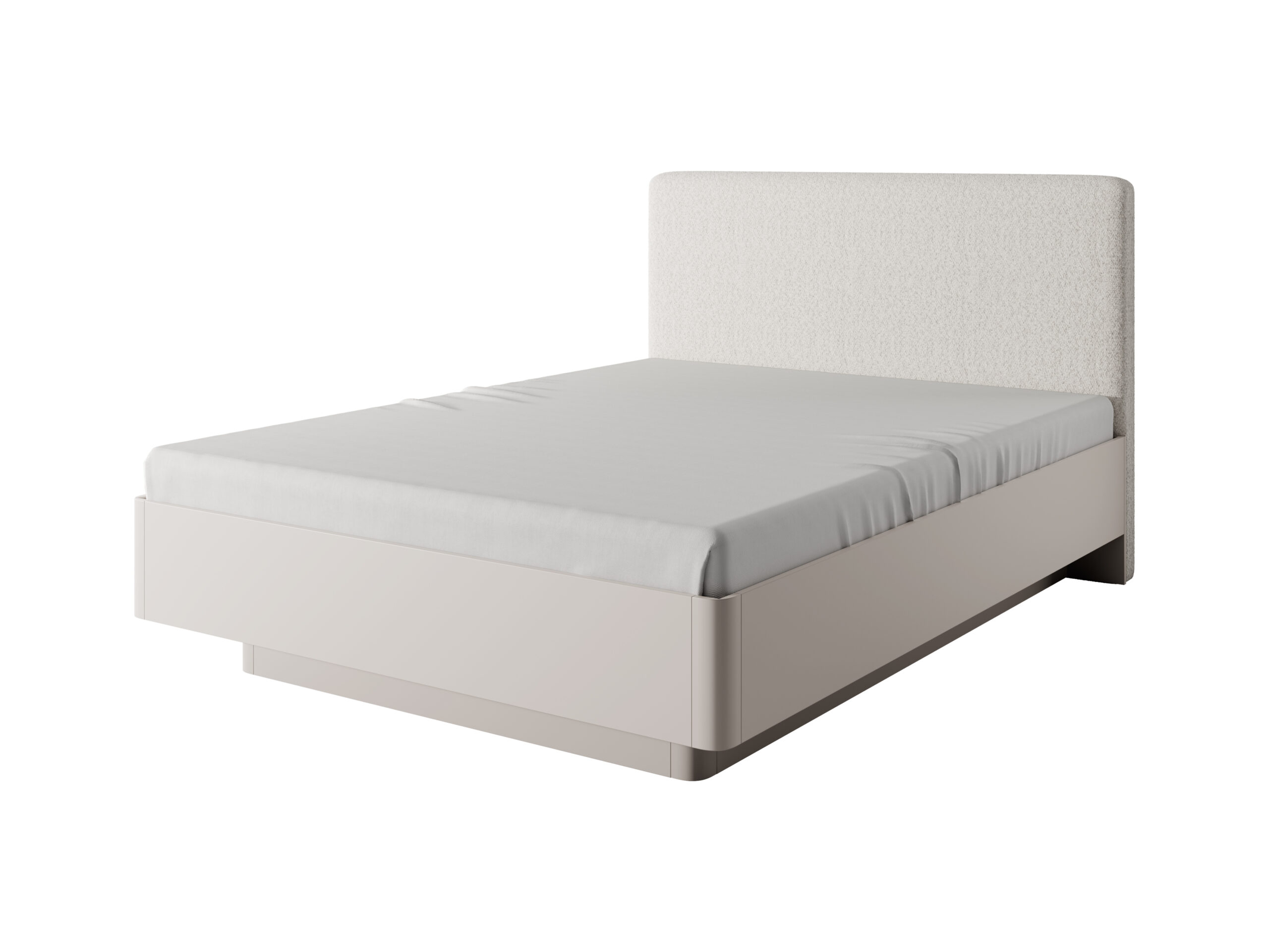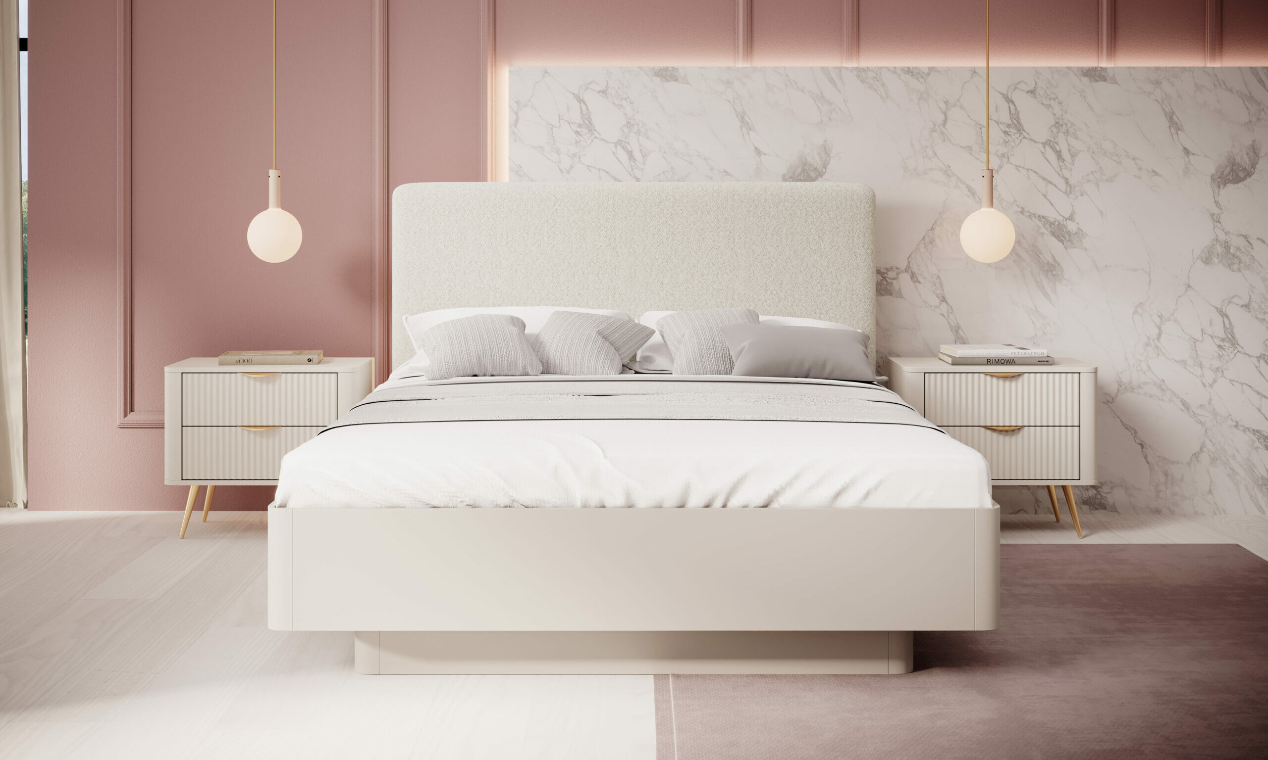 La collection ASTA se distingue par ses façades rainurées, ses courbes adoucies et ses finitions raffinées. La couleur beige sable crée une ambiance douce et lumineuse. Les pieds et poignées en métal doré soulignent le style chic et contemporain de l’ensemble. Le lit, les chevets et la commode partagent la même esthétique, avec des lignes modernes et des détails élégants. Le tout forme un aménagement harmonieux, idéal pour une chambre parentale ou une suite.