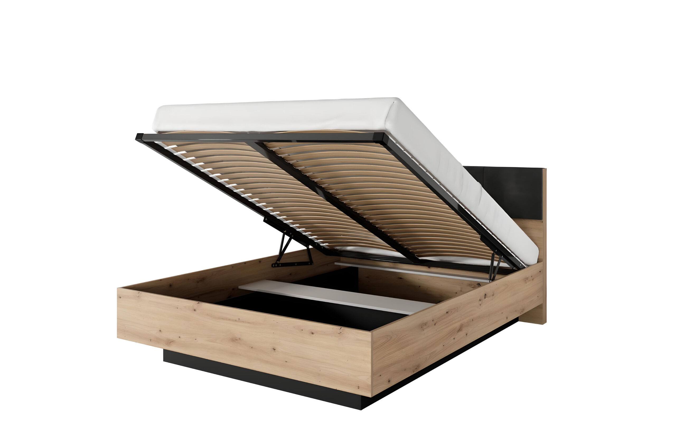 - Lit coffre LYTA : Style moderne en couleurs chêne et noir, parfait pour toute chambre à la décoration actuelle.