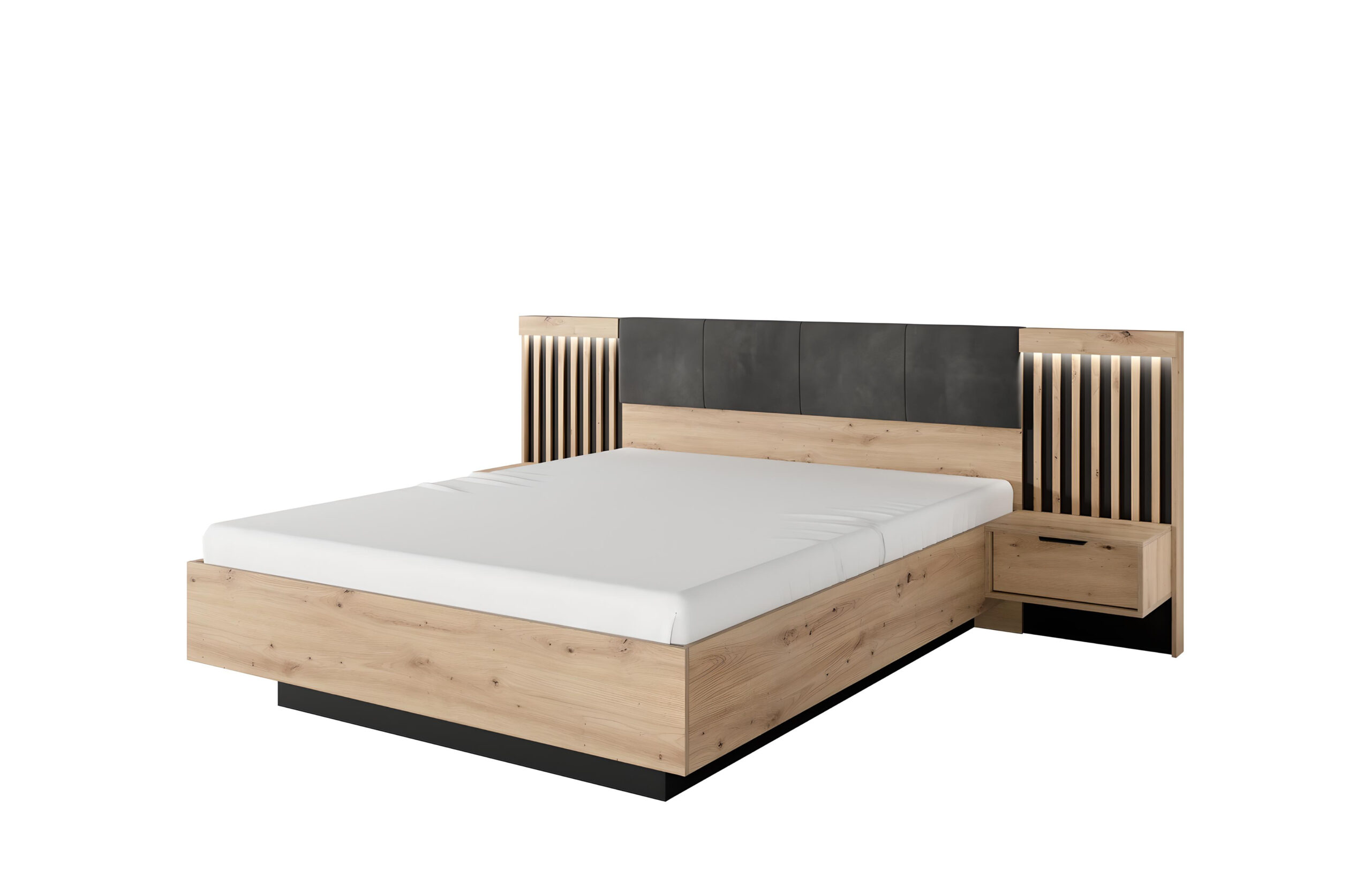 Lit coffre 160cm Chevets LED et sommier relevable inclus Chêne et Noir – LYTA