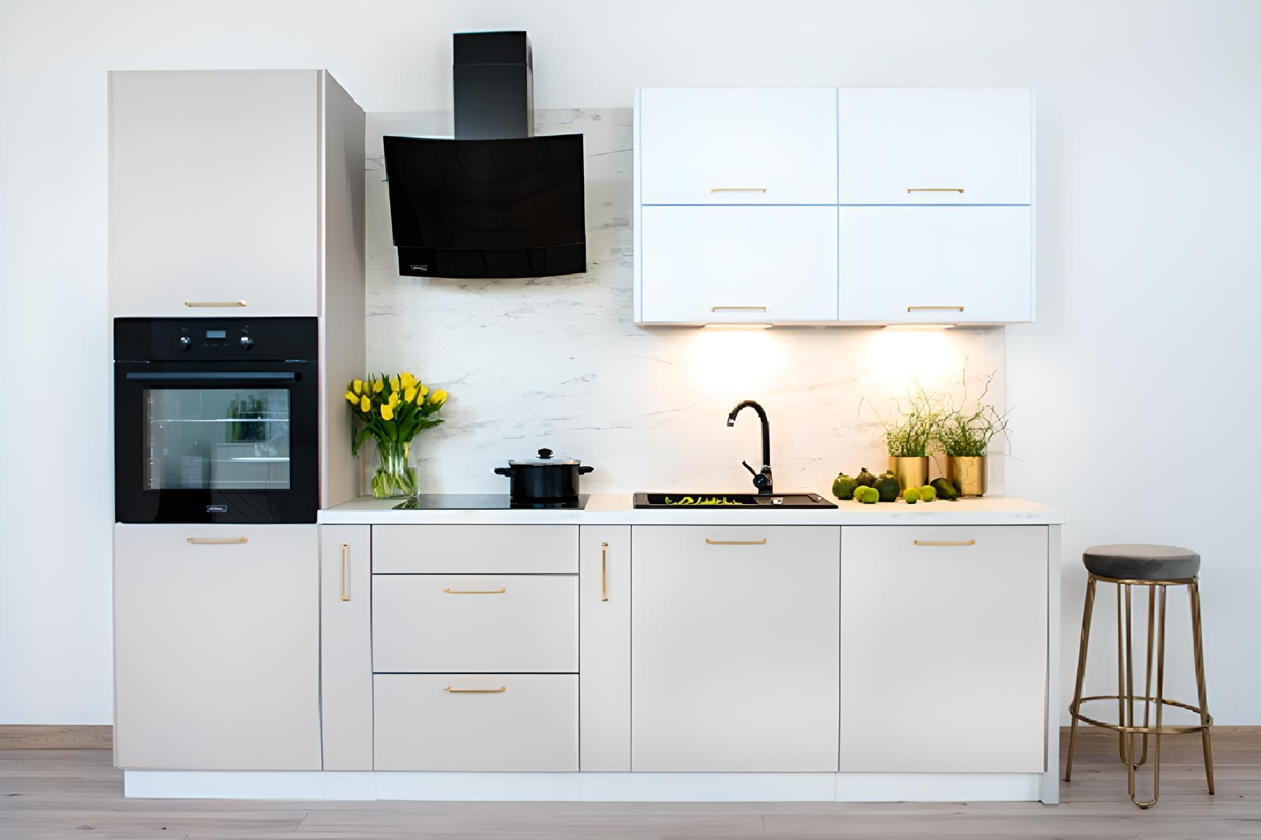 Avec une finition beige mat lisse et blanc strié, dotée de poignés dorées, la cuisine KATIA offre une allure sophistiquée et contemporaine. Les surfaces lisses reflètent subtilement la lumière, tandis que les contrastes avec des éléments striés apporte une touche décorative.