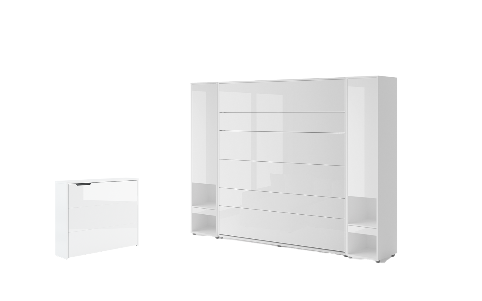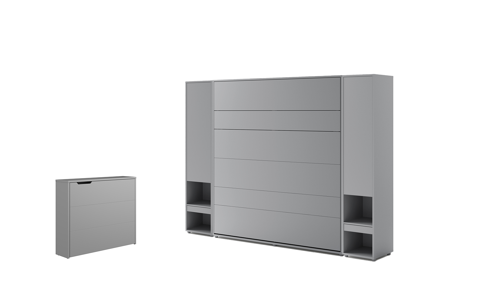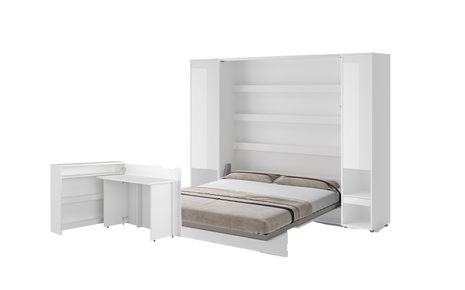 Le lit escamotable SMART, grâce à son mécanisme de levage pneumatique, se replie sans effort tout en gardant la literie en place grâce à ses sangles. Les deux armoires assorties ajoutent des rangements spacieux pour vos vêtements et accessoires, tout en intégrant des tables de chevet dissimulées qui se déplient pour une utilisation pratique. Le bureau ENJOY, avec son ouverture à droite et ses trois étagères intégrées, complète cet ensemble en offrant un espace de travail fonctionnel et esthétique.