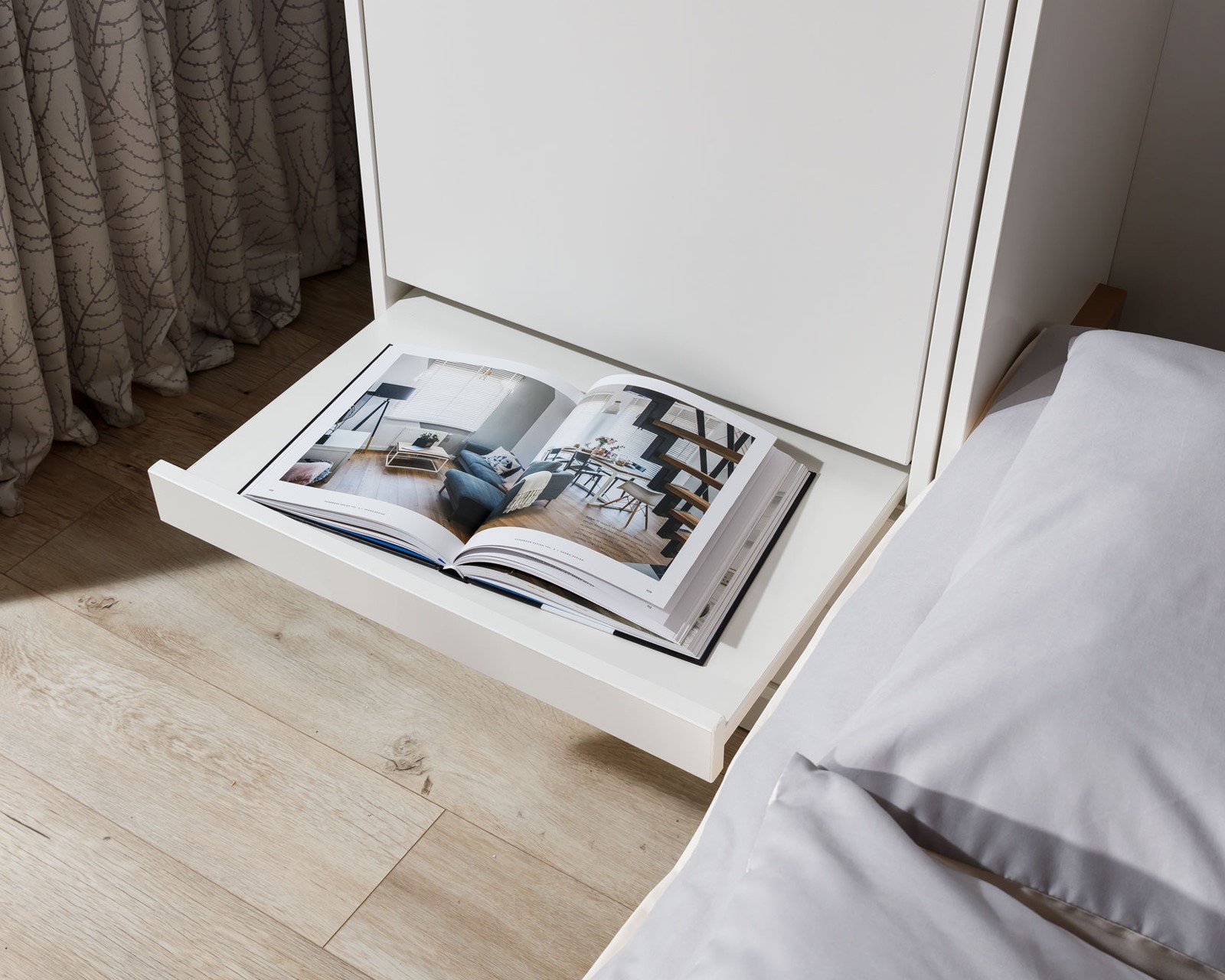 En plus de son rôle principal de lit, le lit escamotable avec rangements ZEN 140 x 200 est équipé d’armoires de rangement intelligemment conçues de chaque côté. À gauche, une armoire avec penderie offre un espace idéal pour suspendre des vêtements et organiser vos tenues ainsi qu’une table de chevet d’appoint et 2 tiroirs. À droite, une autre armoire avec six étagères spacieuses permet de ranger soigneusement vos objets, des livres aux accessoires. Entre ces deux armoires, un compartiment avec des niches ouvertes est prévu pour exposer des objets décoratifs ou ranger des articles de tous les jours, offrant ainsi un accès facile et une organisation optimale.
