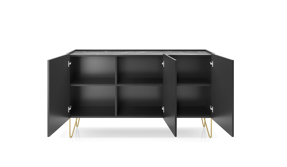 KAMAZZA Buffet ALICIA 144 cm 3 portes – Noir et Marbre Noir Royal