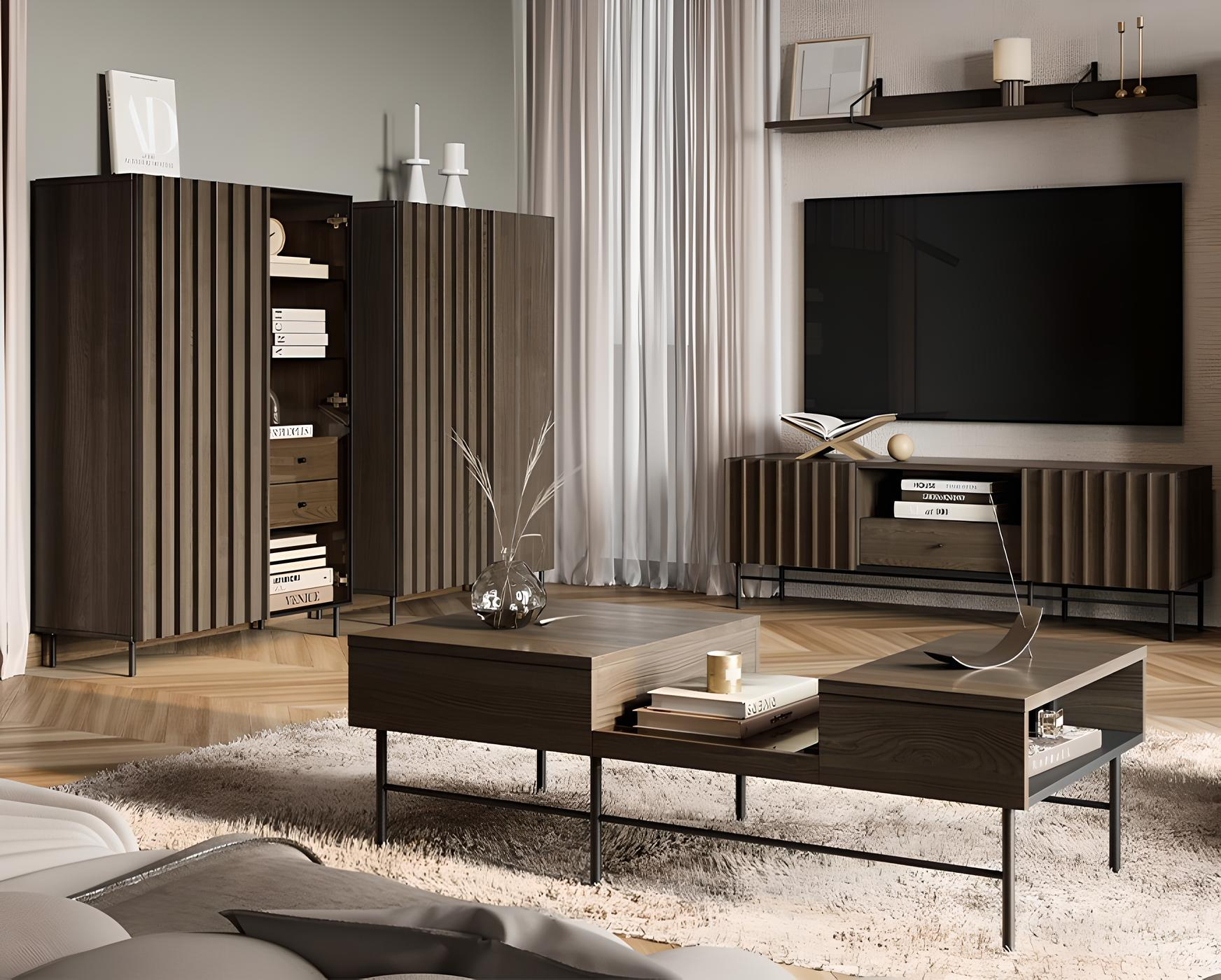 Le buffet haut CARENNE est la quintessence de l’élégance moderne mélangée à une fonctionnalité exceptionnelle. Ce meuble majestueux, avec sa finition en bois foncé contrastée par des détails noirs subtils, apporte une touche de sophistication à tout espace de vie. Son design épuré et contemporain, caractérisé par des lignes simples et un aspect minimaliste, le rend idéal pour les intérieurs modernes ainsi que pour ceux qui recherchent un élément de style intemporel.