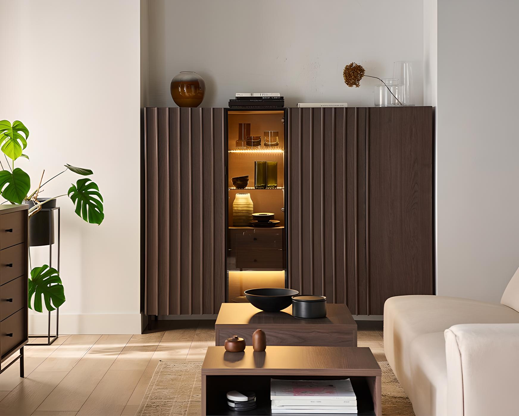 - Rangement optimisé : Deux portes cachant huit étagères spacieuses, idéales pour organiser efficacement vaisselle, livres, ou appareils multimédia, tout en maintenant un environnement ordonné et esthétique.
