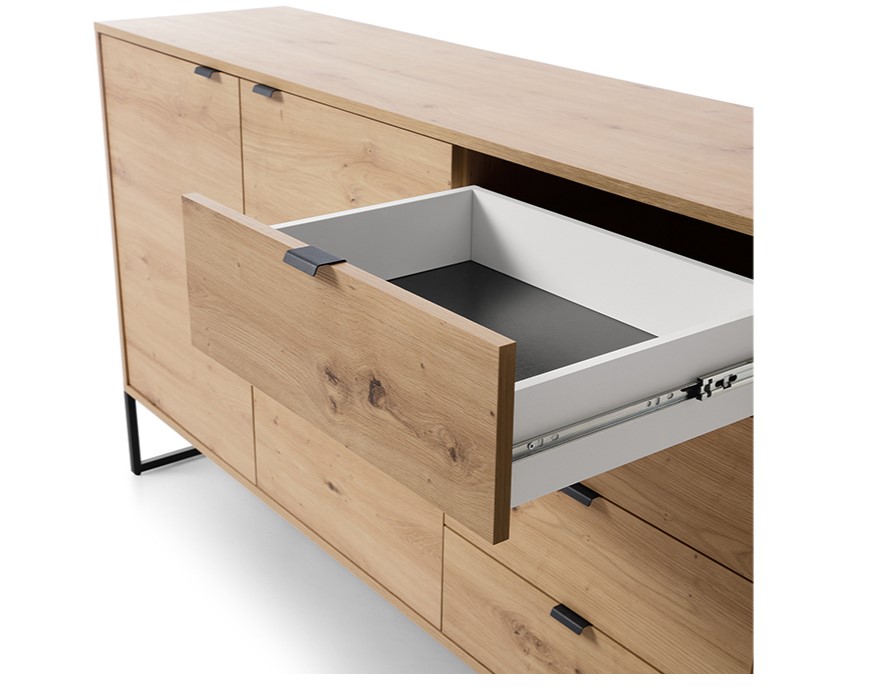 Les pieds en métal noir du Buffet CELINE renforcent son allure industrielle, tout en assurant une stabilité et une solidité inégalées. Cette base métallique ne se contente pas d’ajouter une touche esthétique ; elle offre une fondation solide qui garantit la longévité et la durabilité de la pièce. Le contraste entre le bois de chêne naturel et le métal noir crée un équilibre visuel saisissant, faisant de ce buffet un point focal dans tout salon moderne.