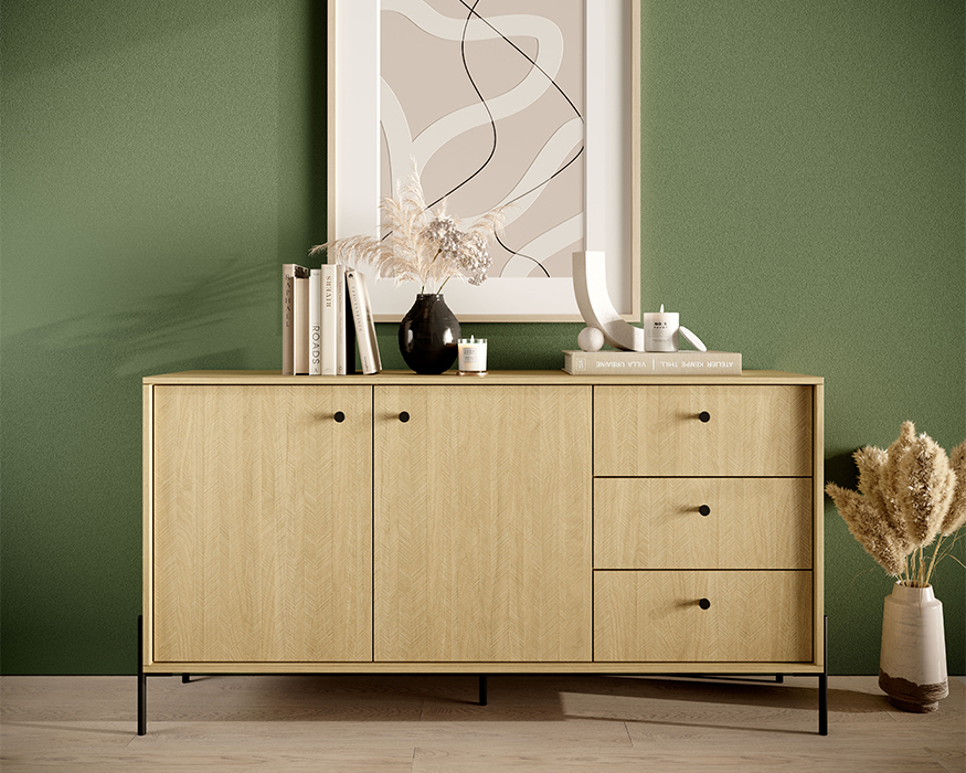 Le buffet bas NAVDI reflète la fonctionnalité du style Japandi. Les deux portes et trois tiroirs offrent un rangement bien pensé, tout en maintenant une apparence épurée. La finition mélaminée aspect bois clair ajoute une note naturelle, tandis que les détails métalliques noirs confèrent une touche contemporaine.