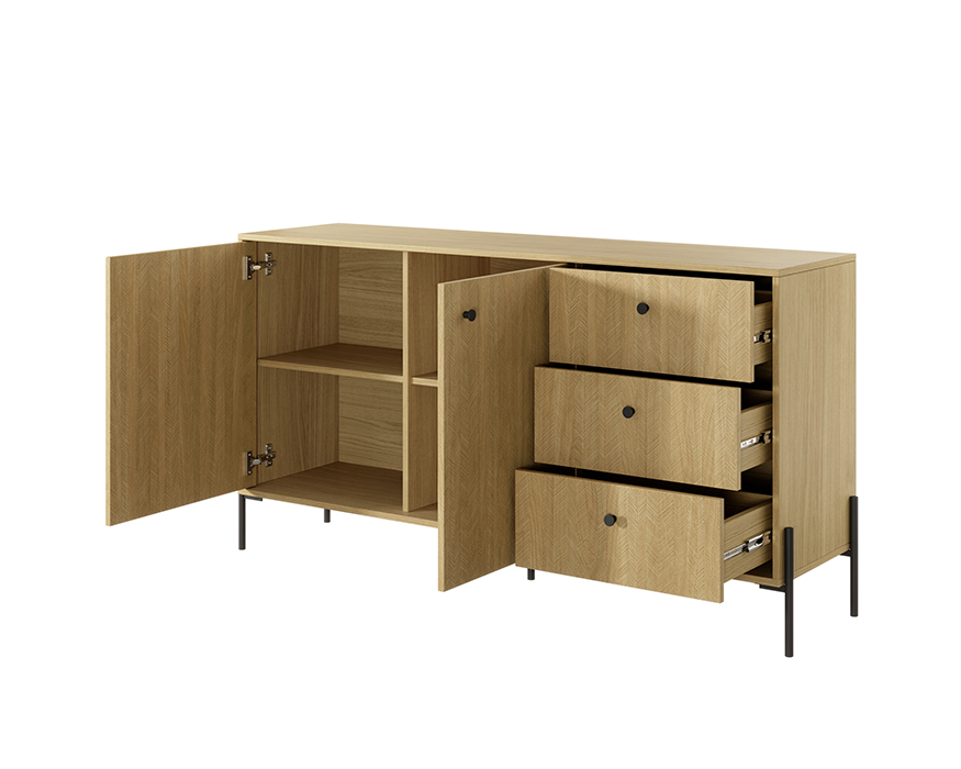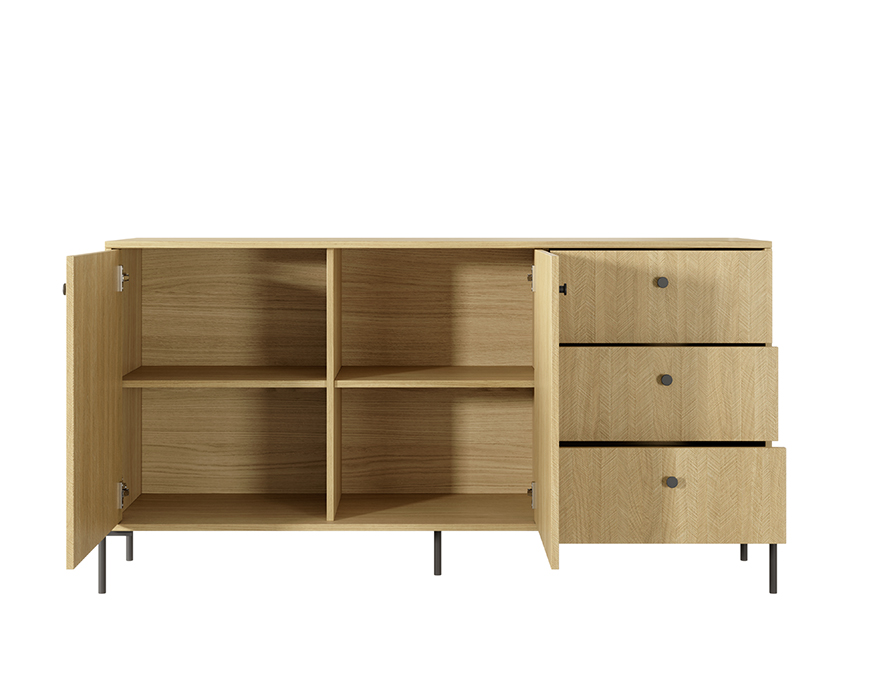- Buffet Bas 3 Tiroirs 2 portes Chêne 160 cm – NAVDI, un Rangement Intelligent : Deux portes, trois tiroirs, une organisation parfaite.
