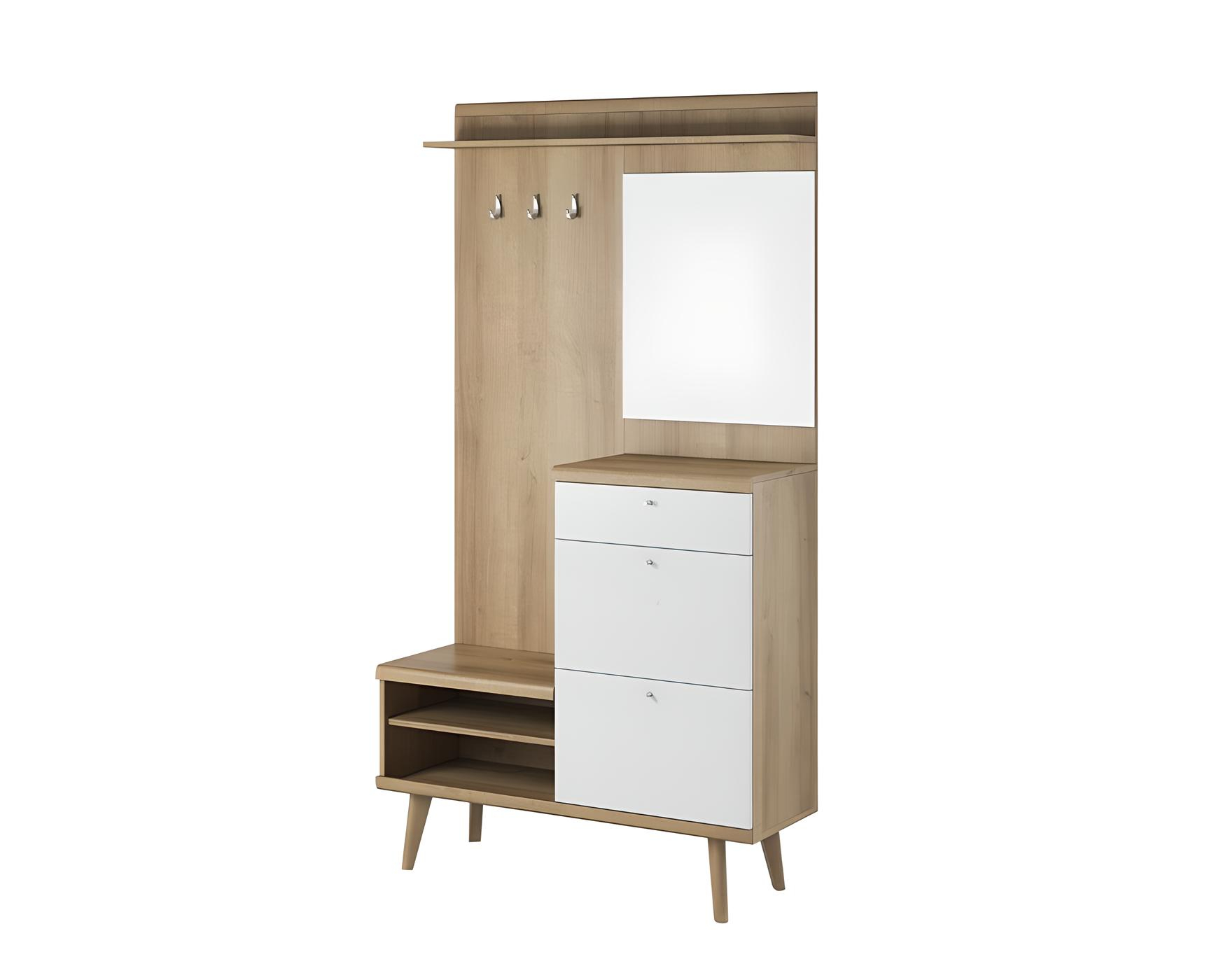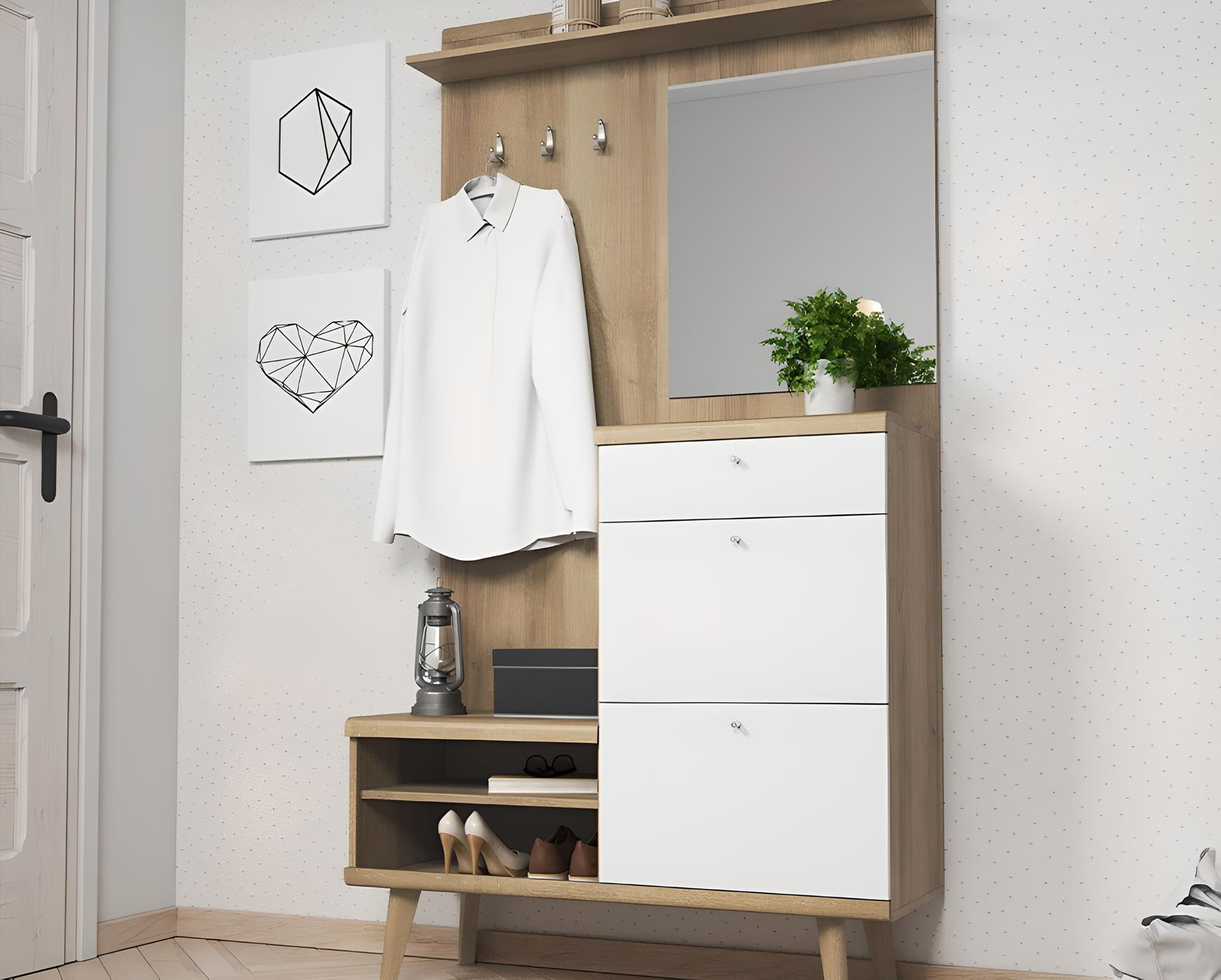 - Fonctionnalité accrue : Doté de deux portes abattantes pour les chaussures, un tiroir pour les petits objets et un porte-manteau, il répond à tous les besoins de rangement dès l’entrée de la maison.