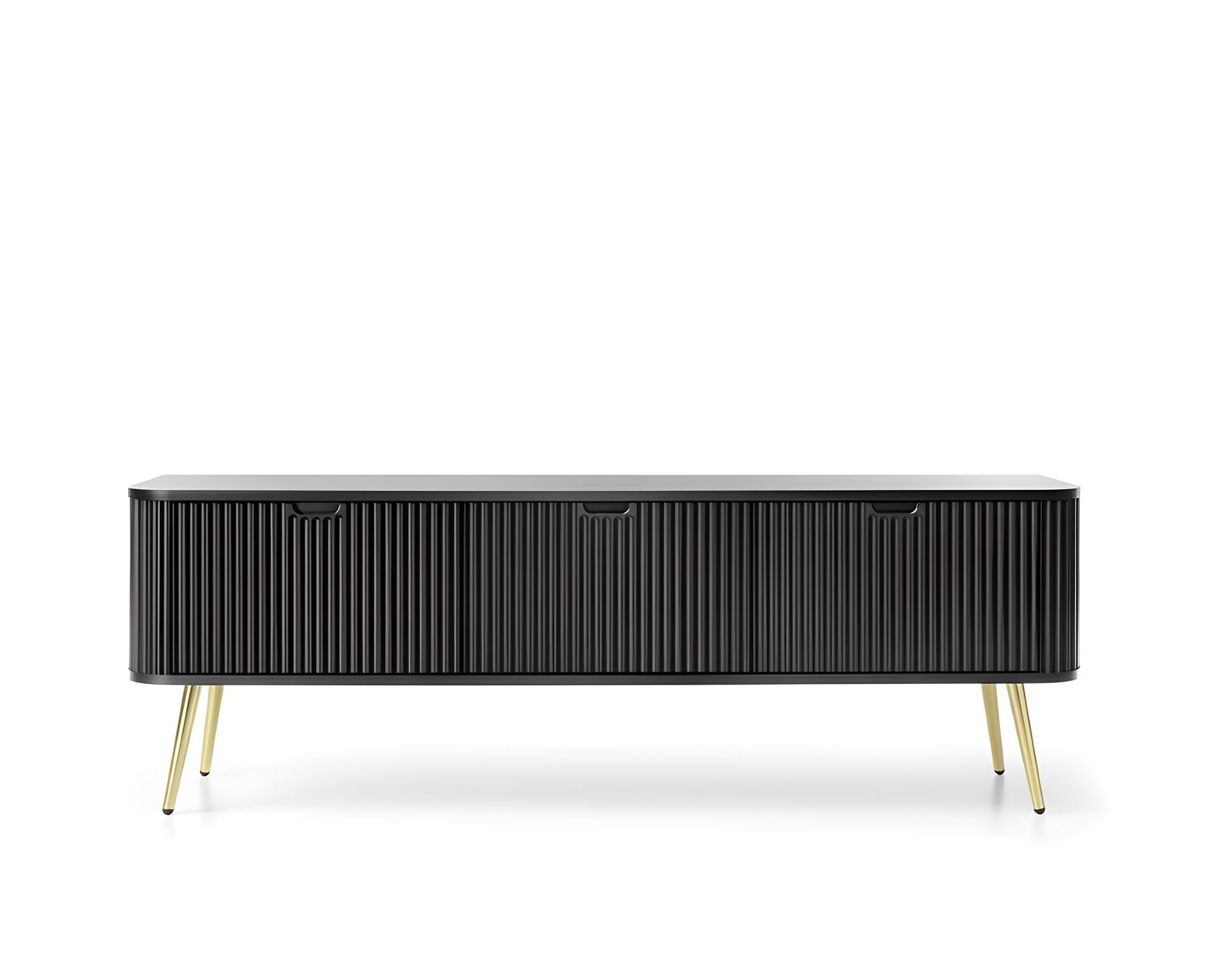 - Élégance contemporaine du meuble télé 3 portes pieds or 170 cm IRIS : Design moderne avec des rainures tendance et des angles arrondis pour un look raffiné