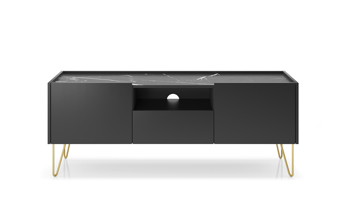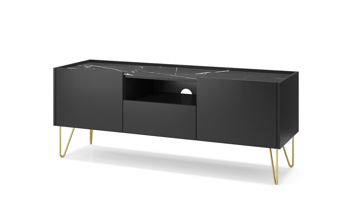 KAMAZZA Meuble Télé ALICIA 144 cm avec 1 tiroirs, 2 portes, 2 étagères et une niche ouverte – Noir et Marbre Noir Royal