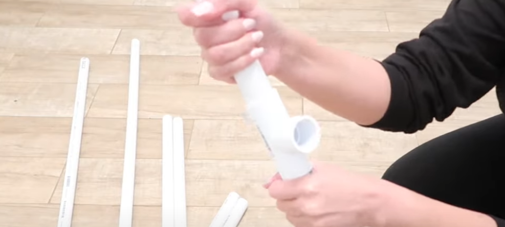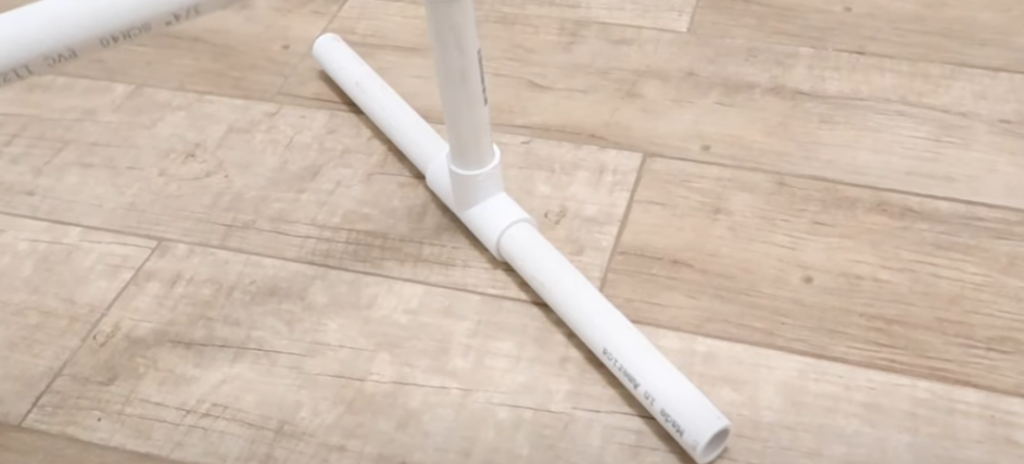 On attaque maintenant le montage du portant. Commencez par la base en insérant les tubes de 8 pouces dans deux tés PVC. Vous obtenez un “H” qui assure la stabilité de l’ensemble.